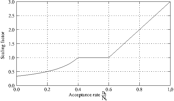 This will modify the basic step length by a factor between 1/3 and 3. The step scaling function is plotted in Fig. 2.6.